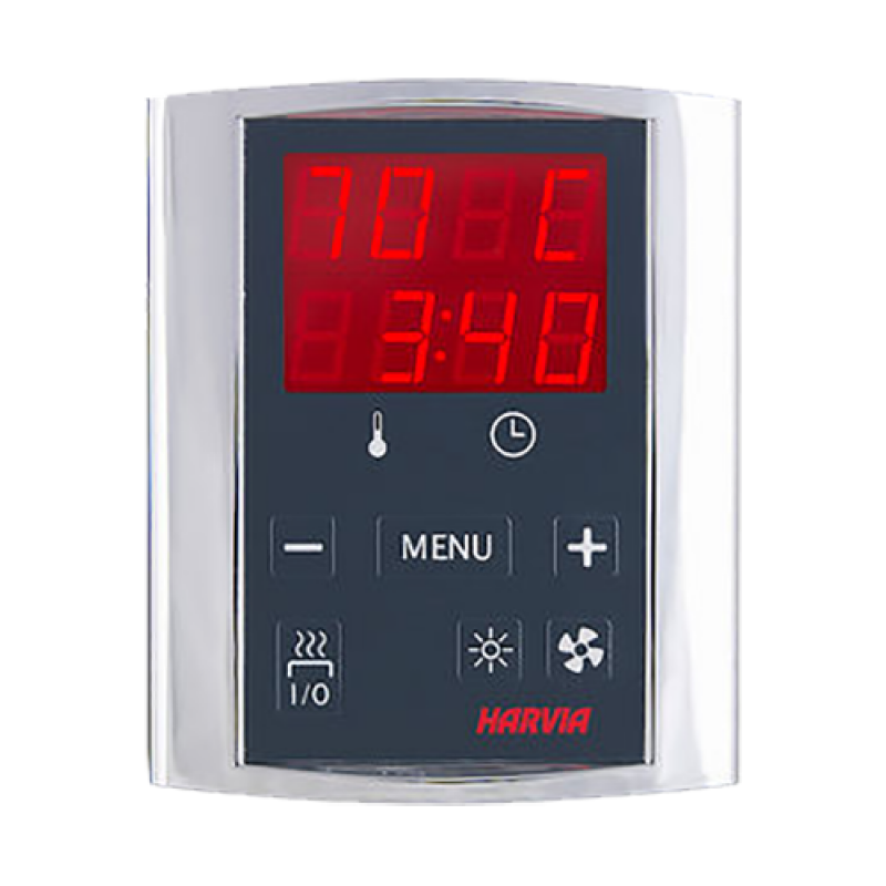 Пульт управления Harvia Griffin CG170 - для печей общей мощностью до 17 кВт. Диапазон настраиваемой температуры – от +40 до +110°C. Пульт контролирует время работы электрокаменки, Температуру в парном помещении, а также возможно, при необходимости, контролировать освещение и вентиляцию.