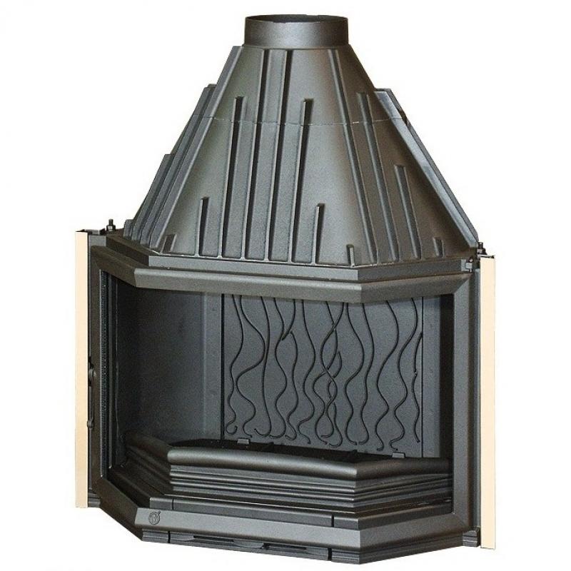 Большая топка с отличными характеристиками. Призматическое стекло дает прекрасную обзорность огня. По бокам расположены стильные латунированные накладки.