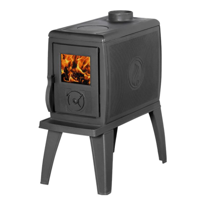Тепловая мощность печи камина 7 кВт. При высоком КПД: 78%. В печи применена безколосниковая система. Дрова при такой системе горят долго, прогарают полностью с минимальным выделением золы и максимально рационально. Подача воздуха для горения осуществляется при помощи регулятора-барабана установленного на дверке. Две боковые и верхняя стенки топки оснащены съёмными отбойниками (стенки двойные). Небольшое стекло имеет систему обдува воздухом. Конфорку на варочной поверхности можно снять и готовить на открытом огне.