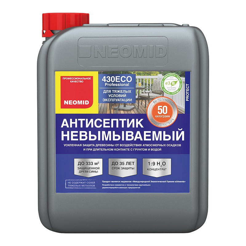 NEOMID 430 ECO — консервирующий невымываемый антисептик для наружных и внутренних работ. Обеспечивает максимальную защиту древесины различных пород в тяжелых условиях эксплуатации, в том числе при длительном контакте с грунтом и влагой.